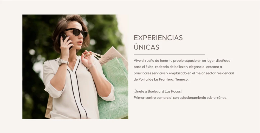 Sitio web para Boulevard Las Rocas, centro comercial en Temuco con locales exclusivos en un espacio moderno. El diseño destaca por su claridad y elegancia, con secciones enfocadas en servicios, locales y contacto.