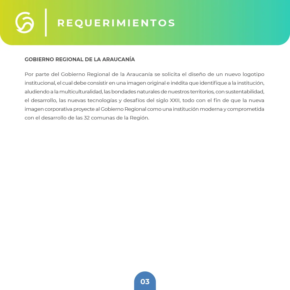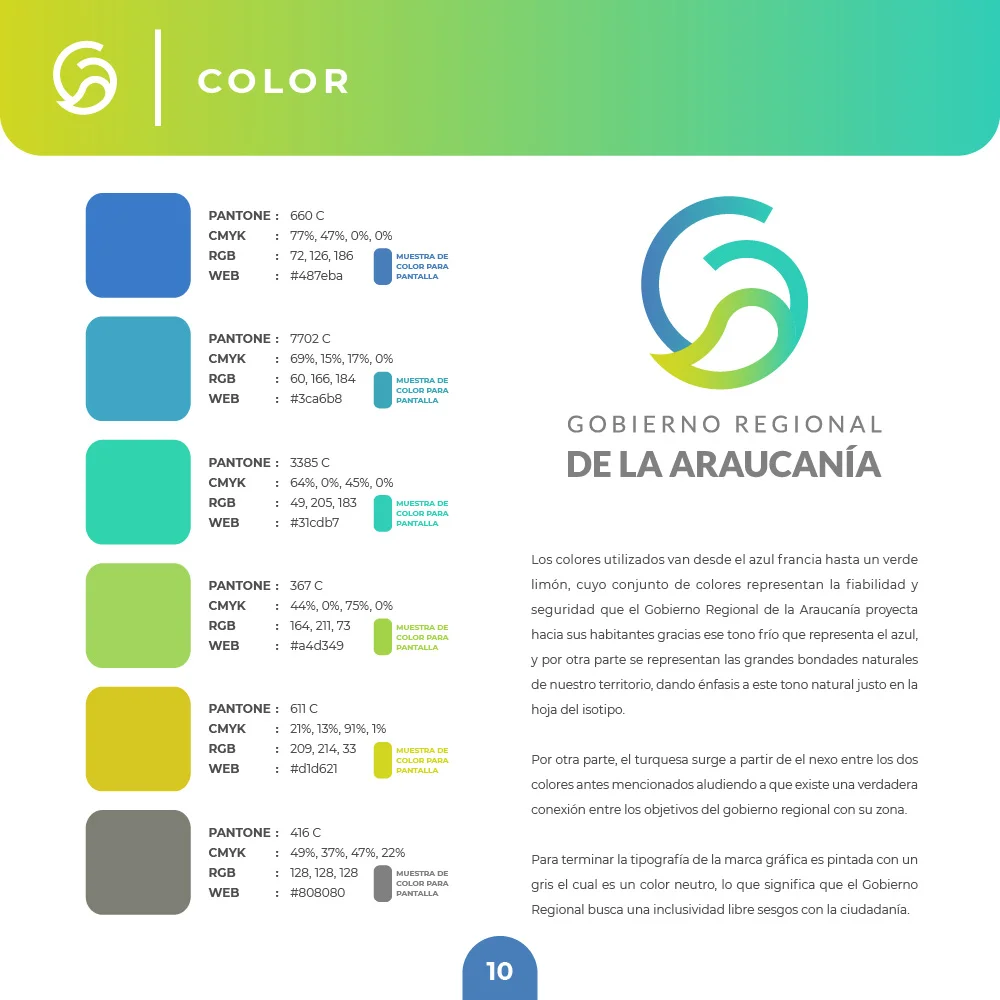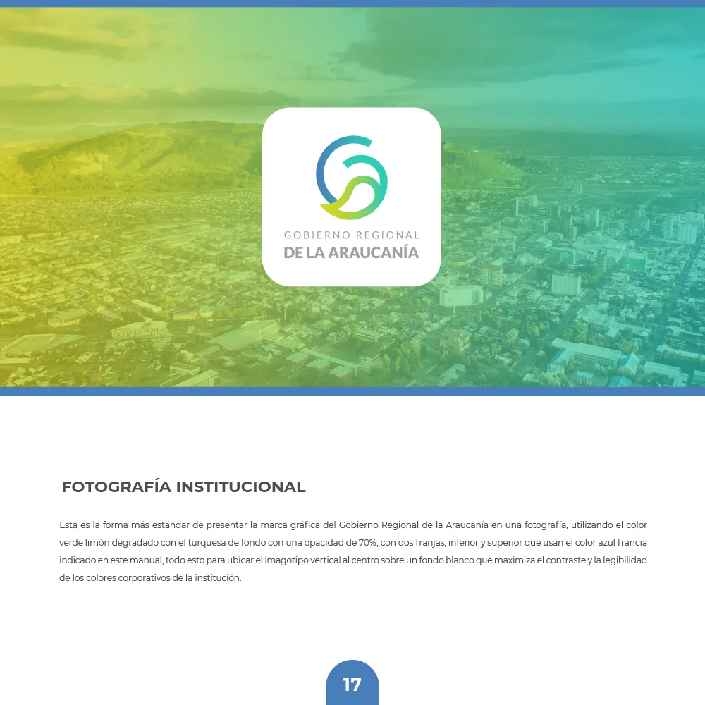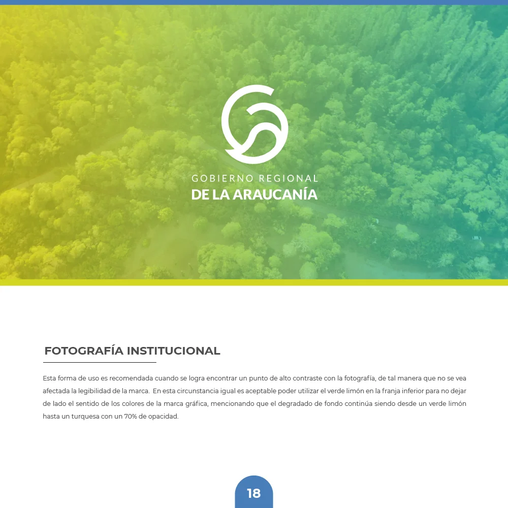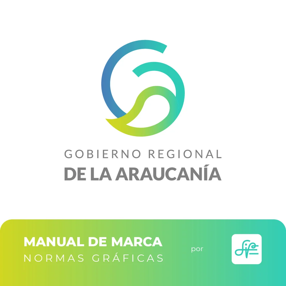 El proyecto para el Gobierno Regional de La Araucanía se resolvió mediante un símbolo que combina curvas amigables y modernas con remates rectos que transmiten solidez institucional. La paleta cromática en tonalidades azules y verdes representa la confianza institucional y las riquezas naturales, mientras el círculo unificador refuerza el concepto de inclusividad y protección ciudadana, garantizando versatilidad en aplicaciones físicas y digitales.