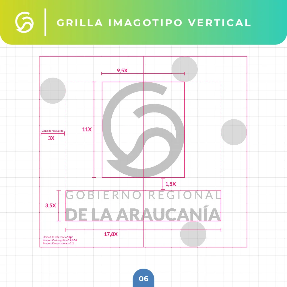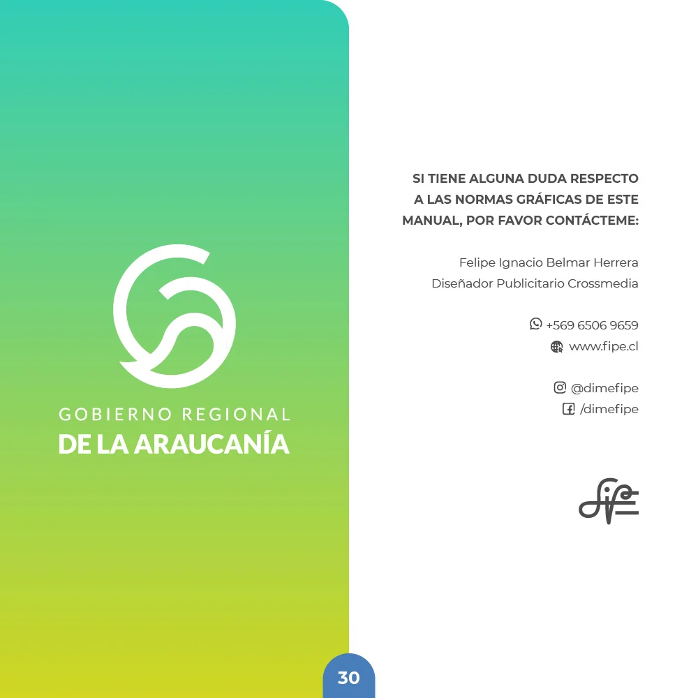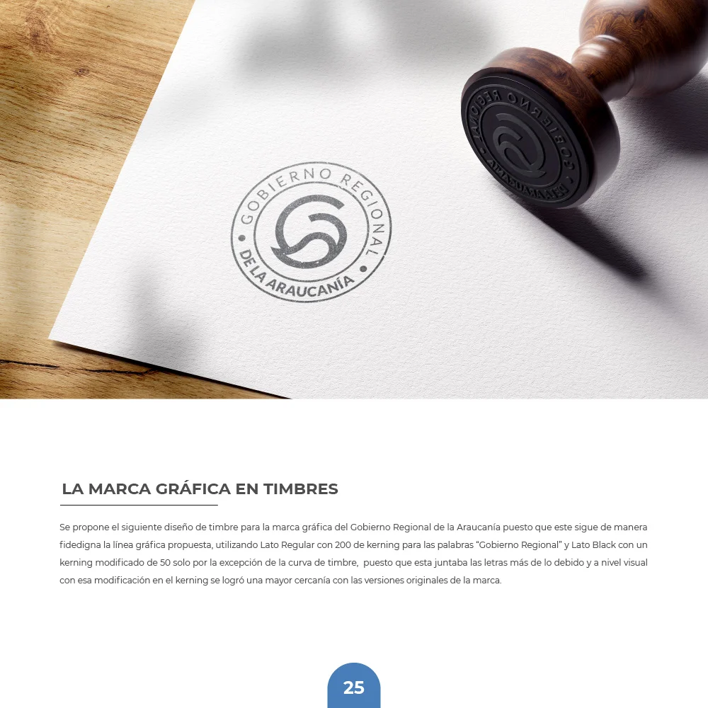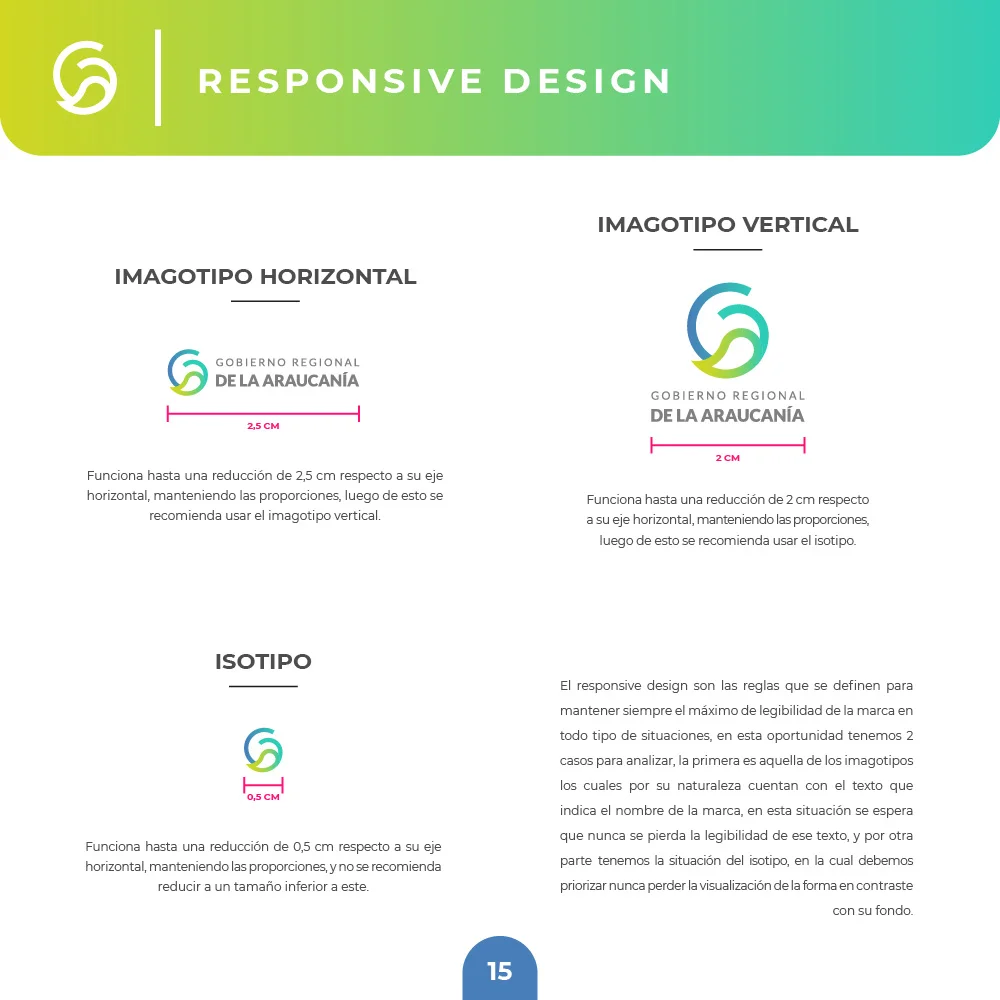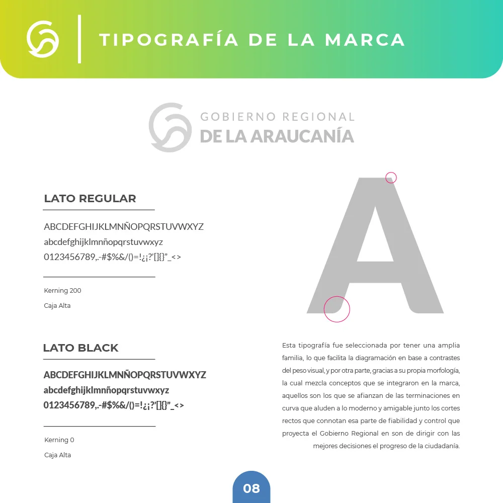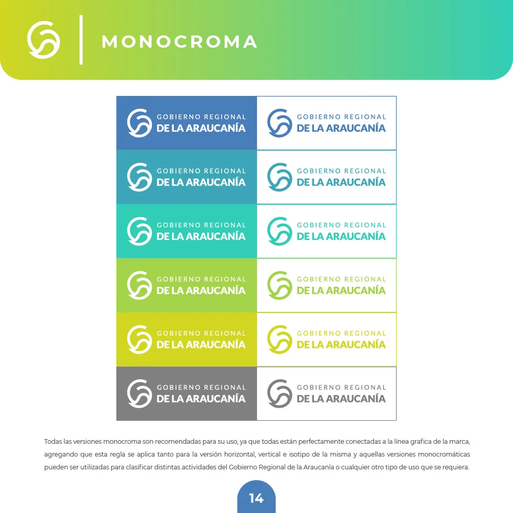 El proyecto para el Gobierno Regional de La Araucanía se resolvió mediante un símbolo que combina curvas amigables y modernas con remates rectos que transmiten solidez institucional. La paleta cromática en tonalidades azules y verdes representa la confianza institucional y las riquezas naturales, mientras el círculo unificador refuerza el concepto de inclusividad y protección ciudadana, garantizando versatilidad en aplicaciones físicas y digitales.