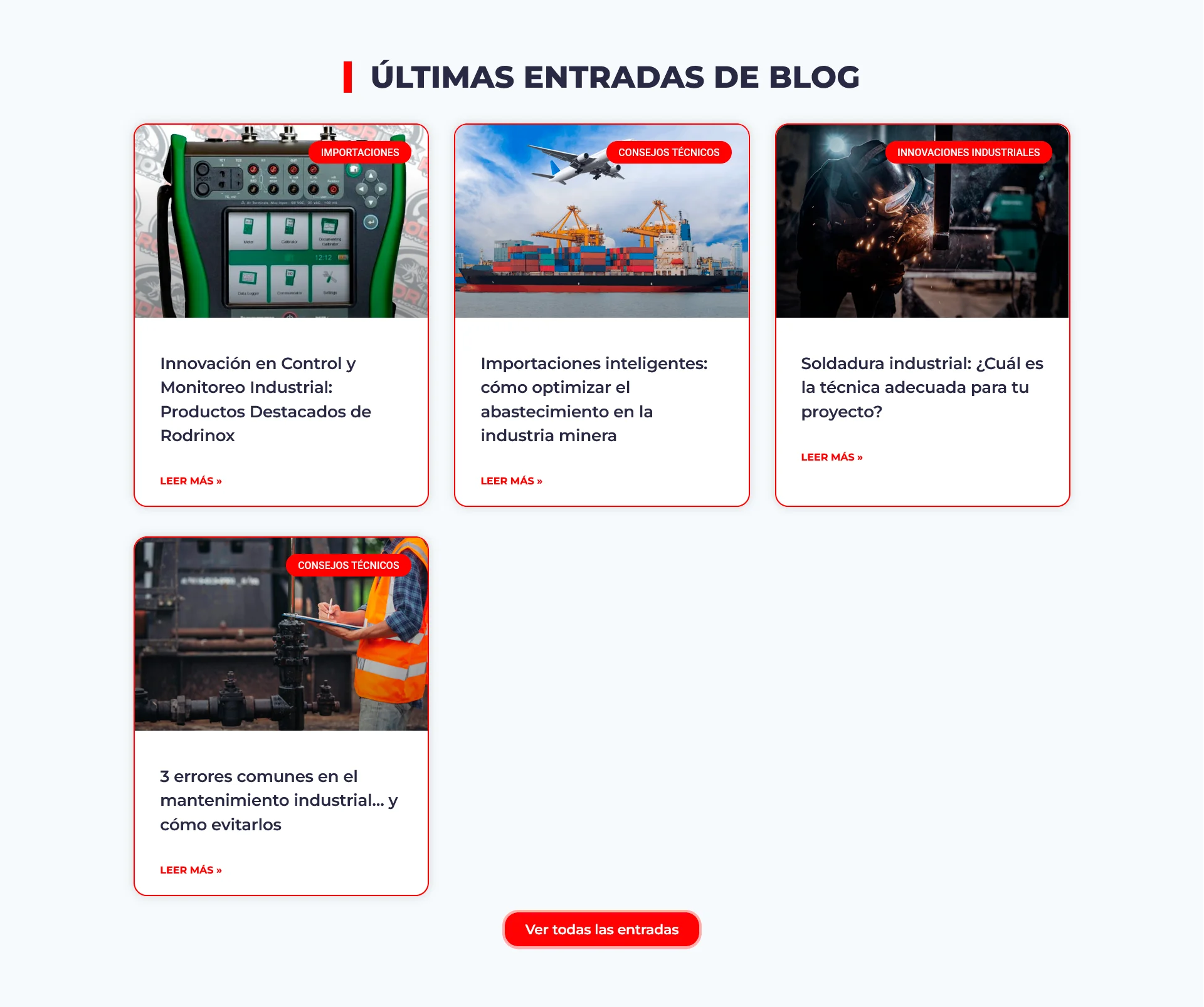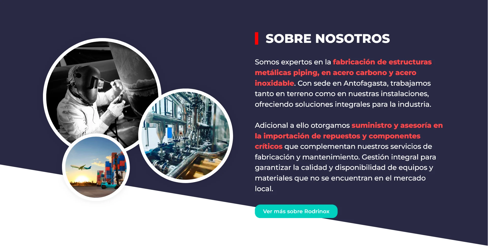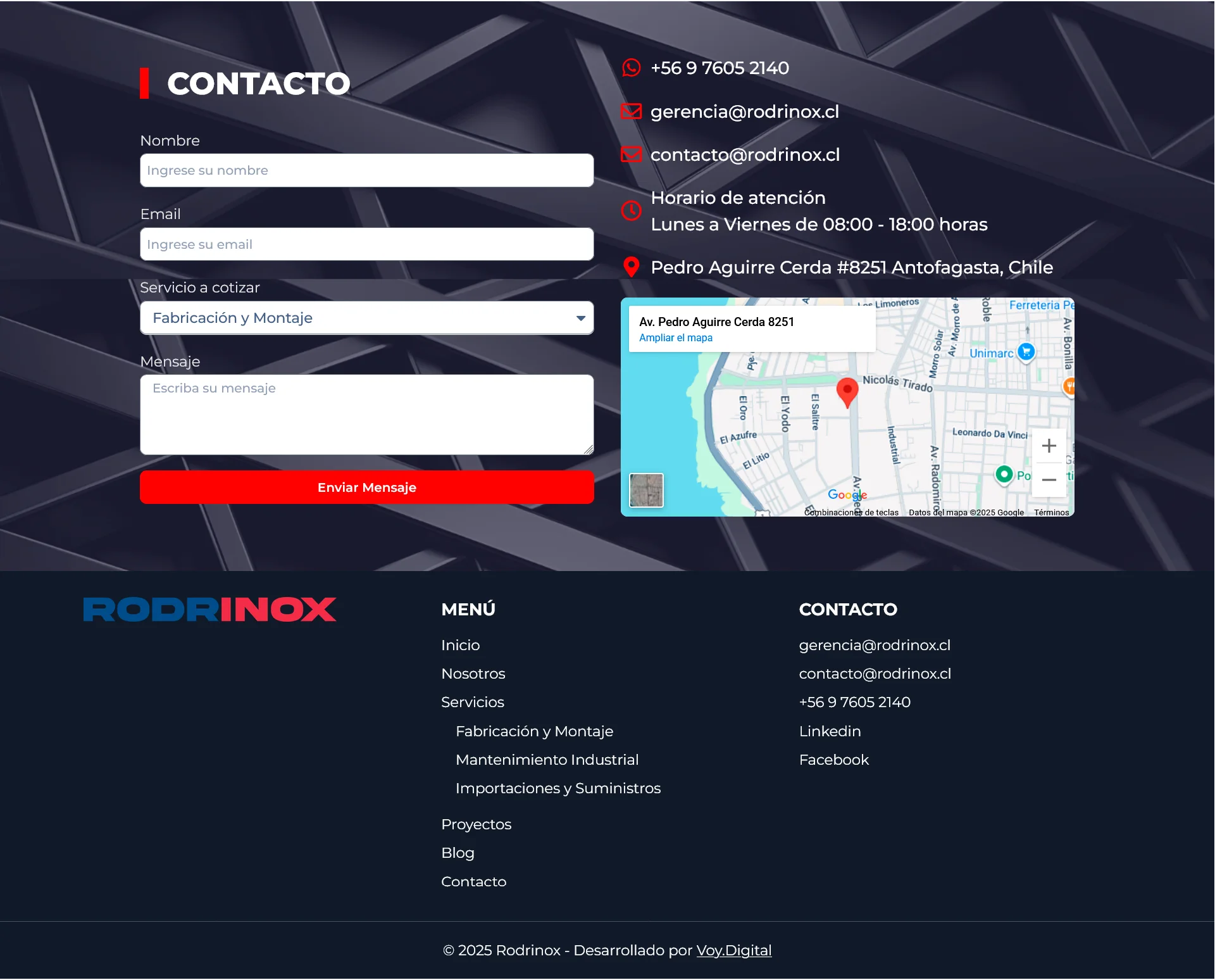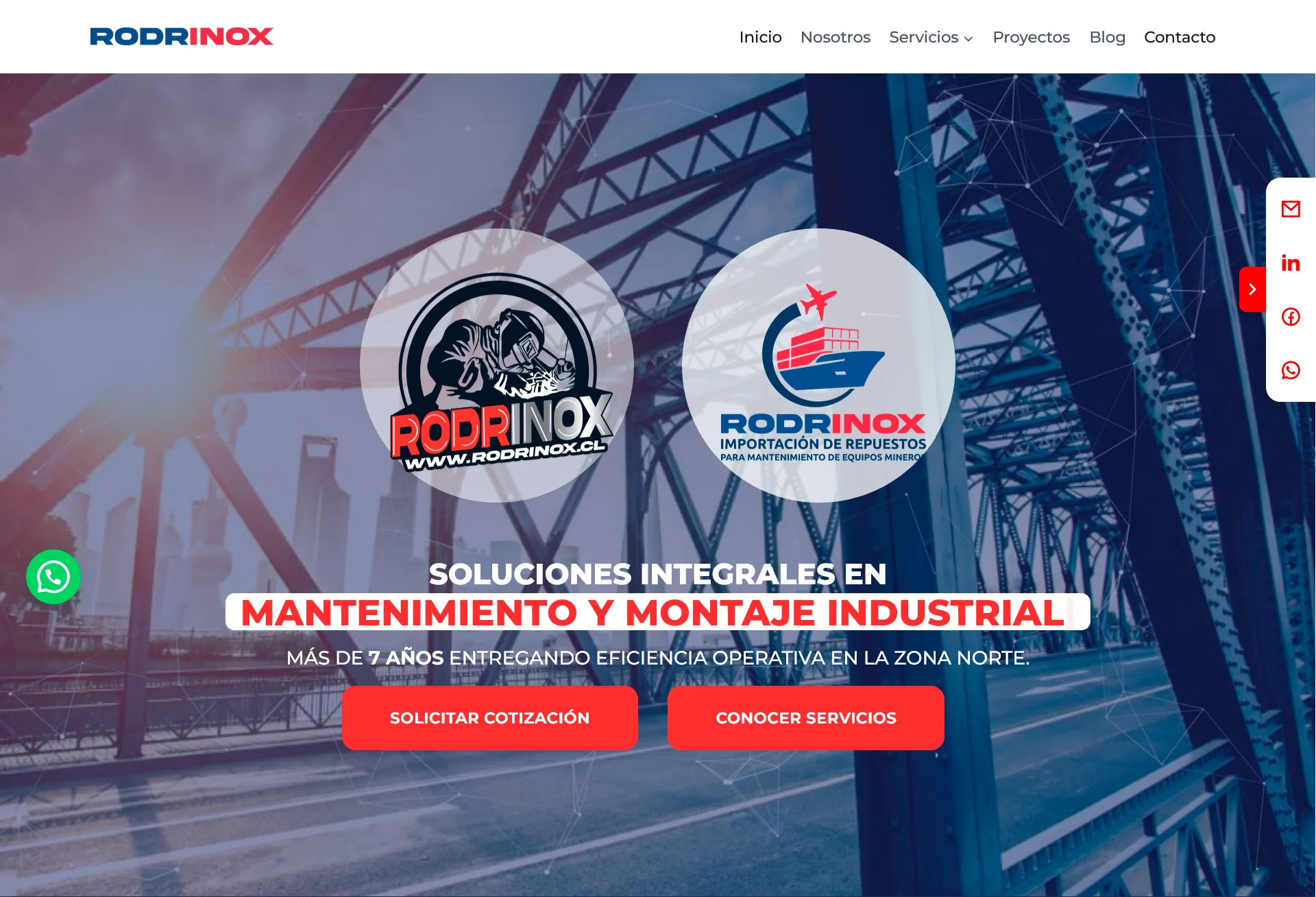 Para Rodrinox se desarrolló un sitio web corporativo que refleja su expertise en soluciones industriales y de mantenimiento minero. El diseño destaca sus servicios de fabricación, importación y mantenimiento, presentando una estructura clara que comunica eficiencia operativa y especialización técnica para la industria del norte de Chile.