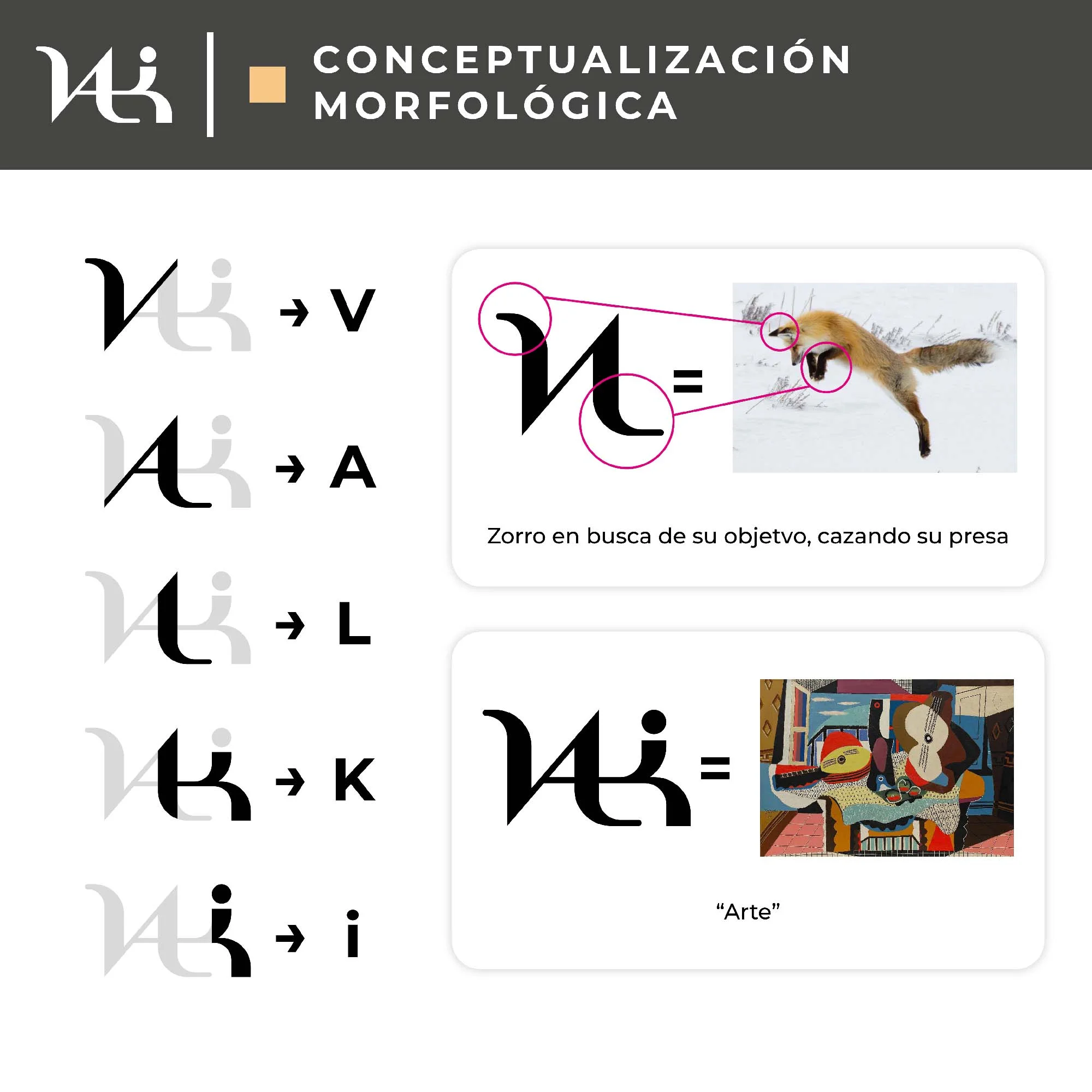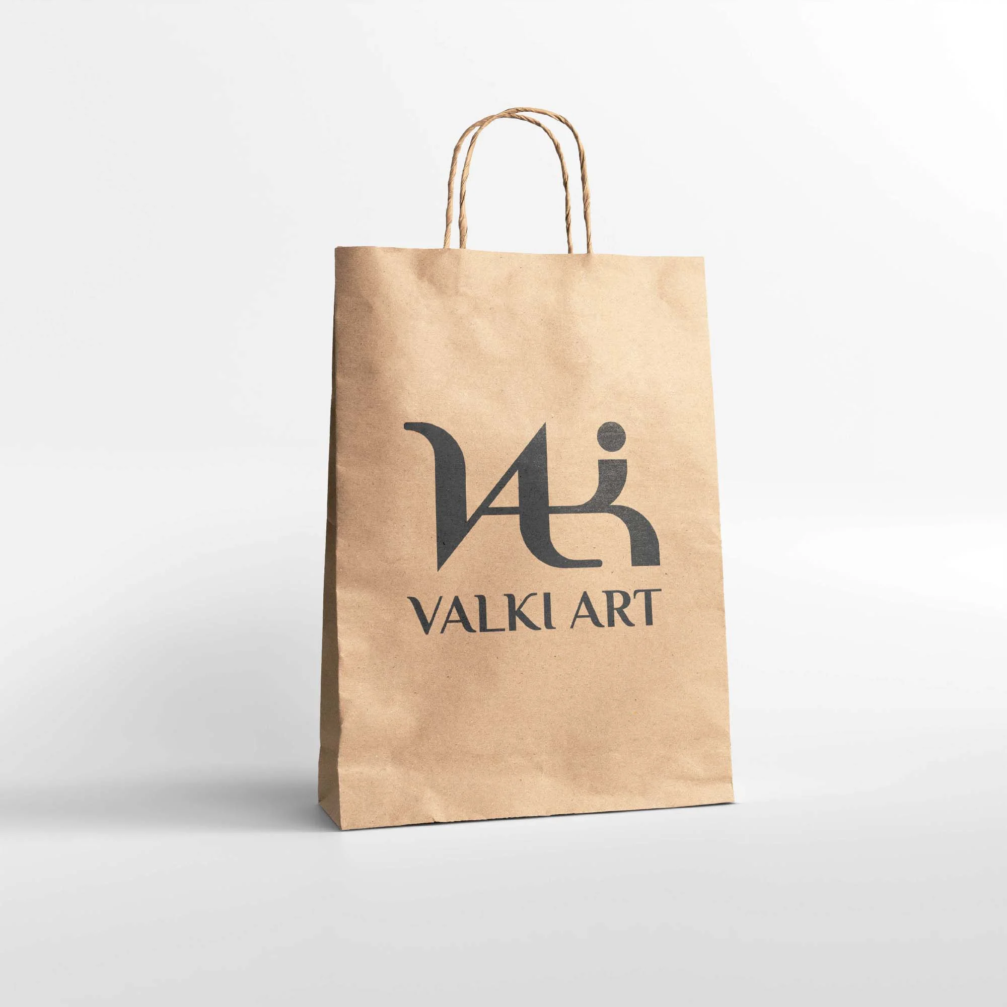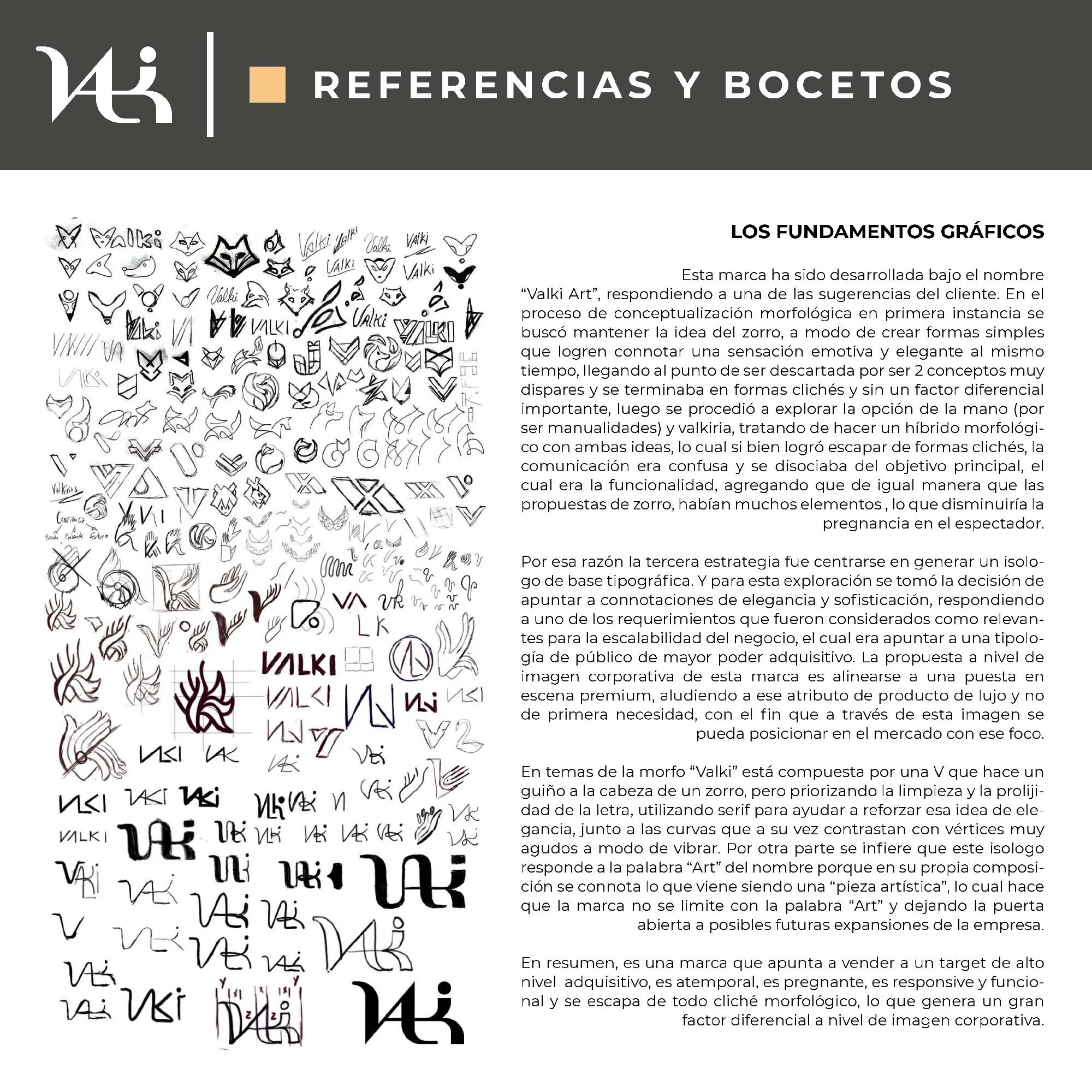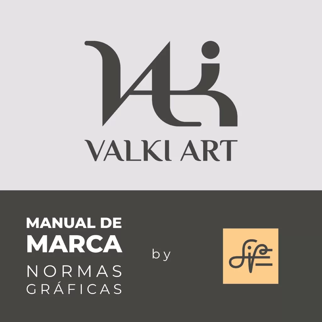 Marca para Valki Art que integra sutilmente la forma de un zorro en la letra "V". Refleja elegancia y sofisticación, posicionando la marca en el segmento premium de manualidades en porcelana fría.